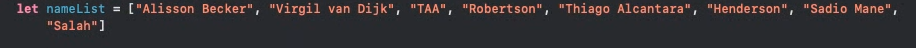 let nameList = ["Alisson Becker", "Virgil van Dijk", "TAA", "Robertson", "Thiago Alcantara", "Henderson", "Sadio Mane", "Salah"]