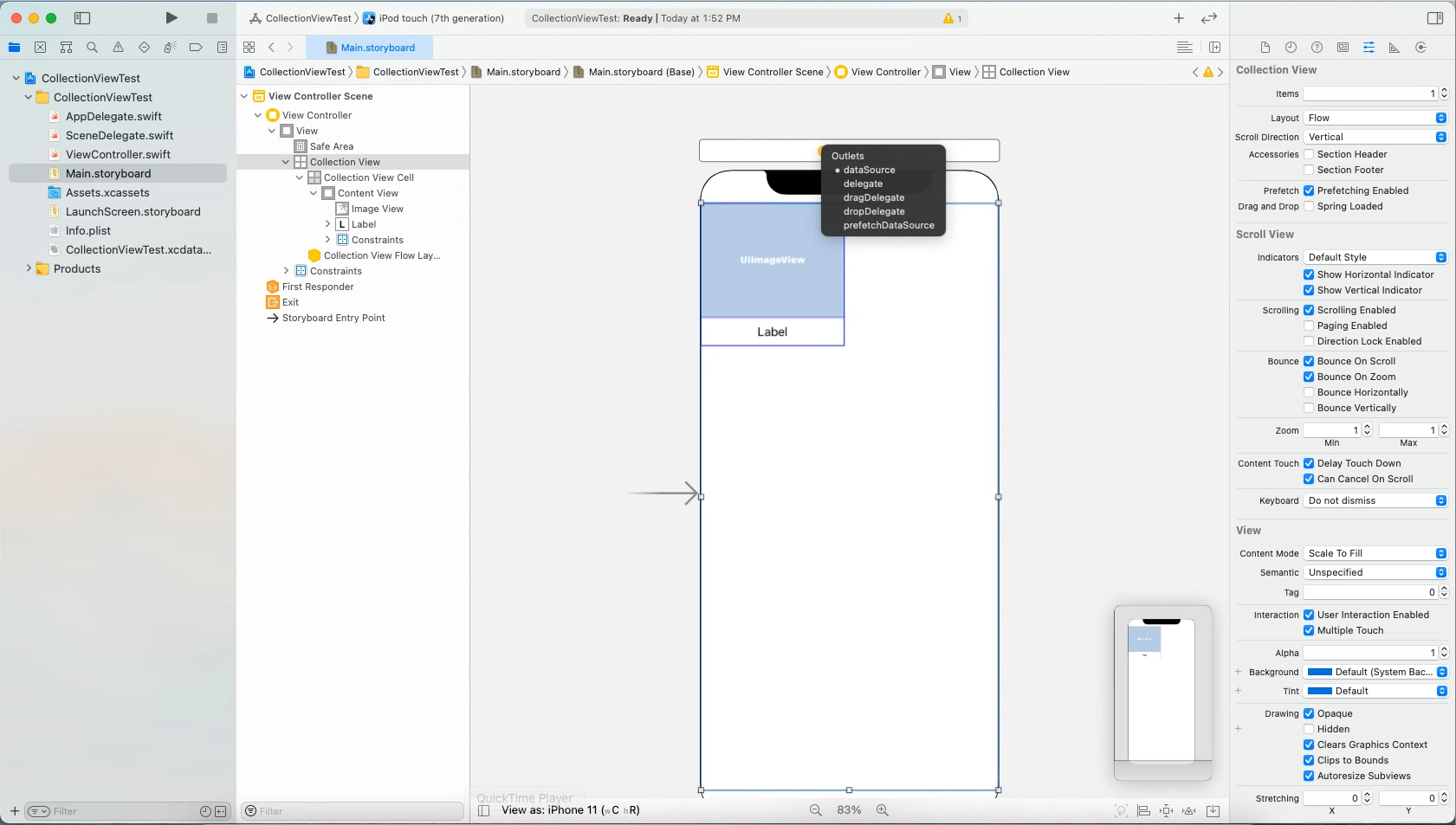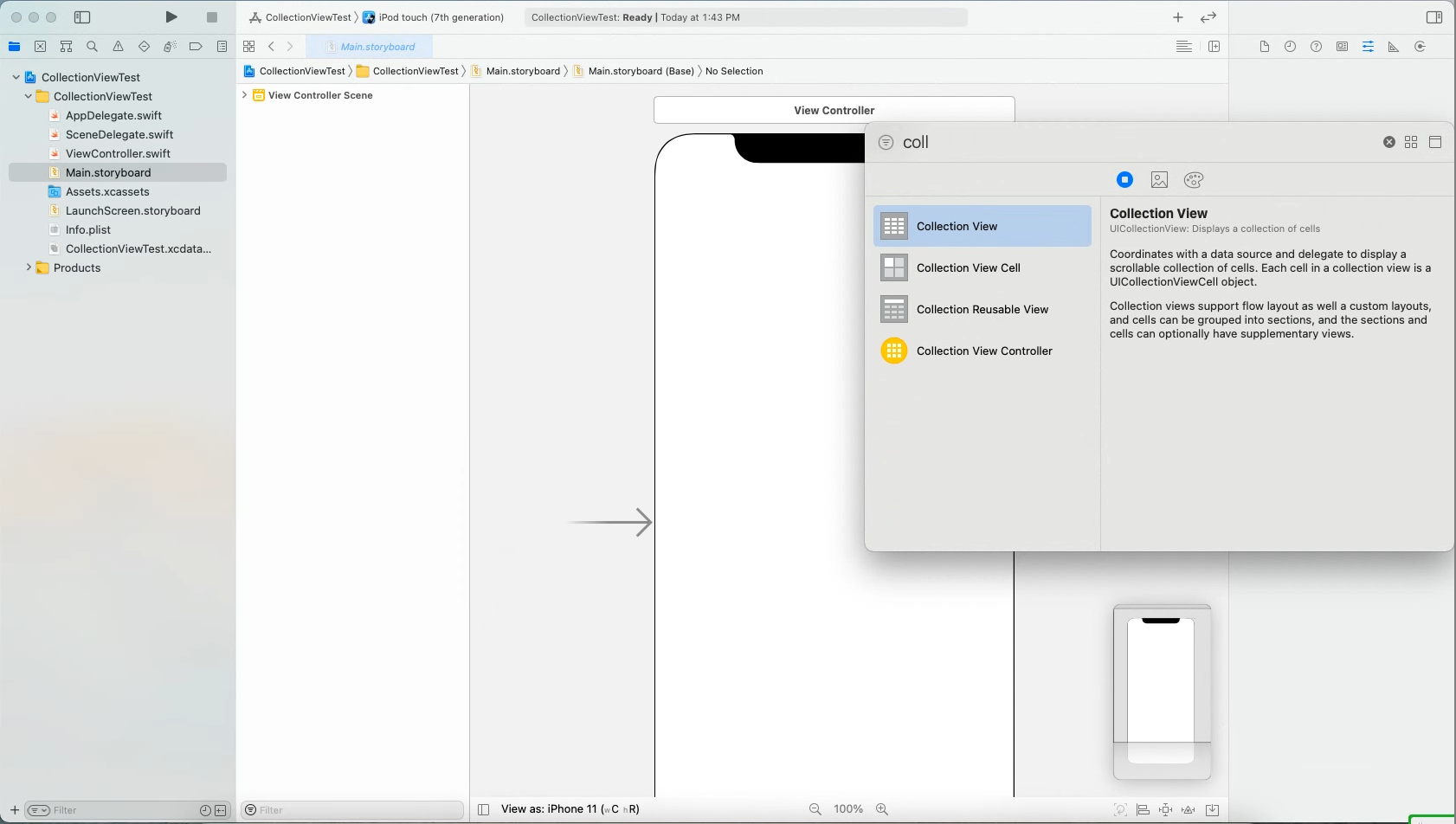 - Collection VIew를 선택한 상태로 드래그해, View Controller에 가져다 놓습니다.