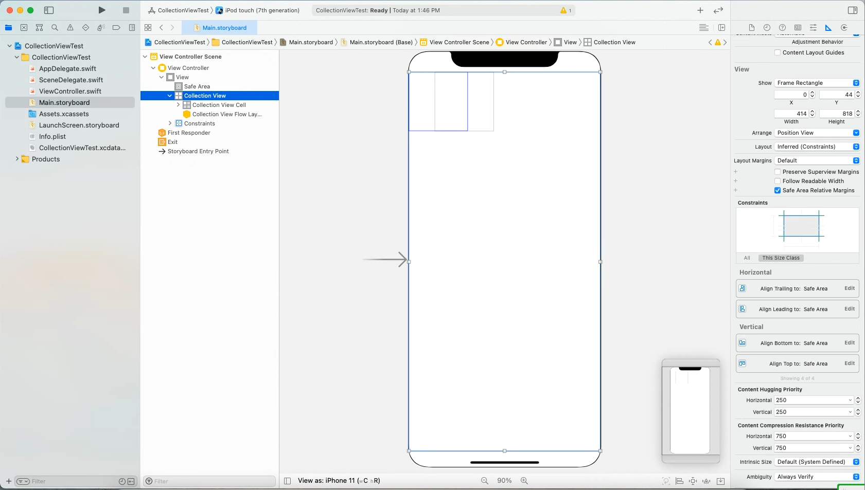 - Collection View를 화면 상하좌우에 꽉차게, 0으로 지정해줍니다.
