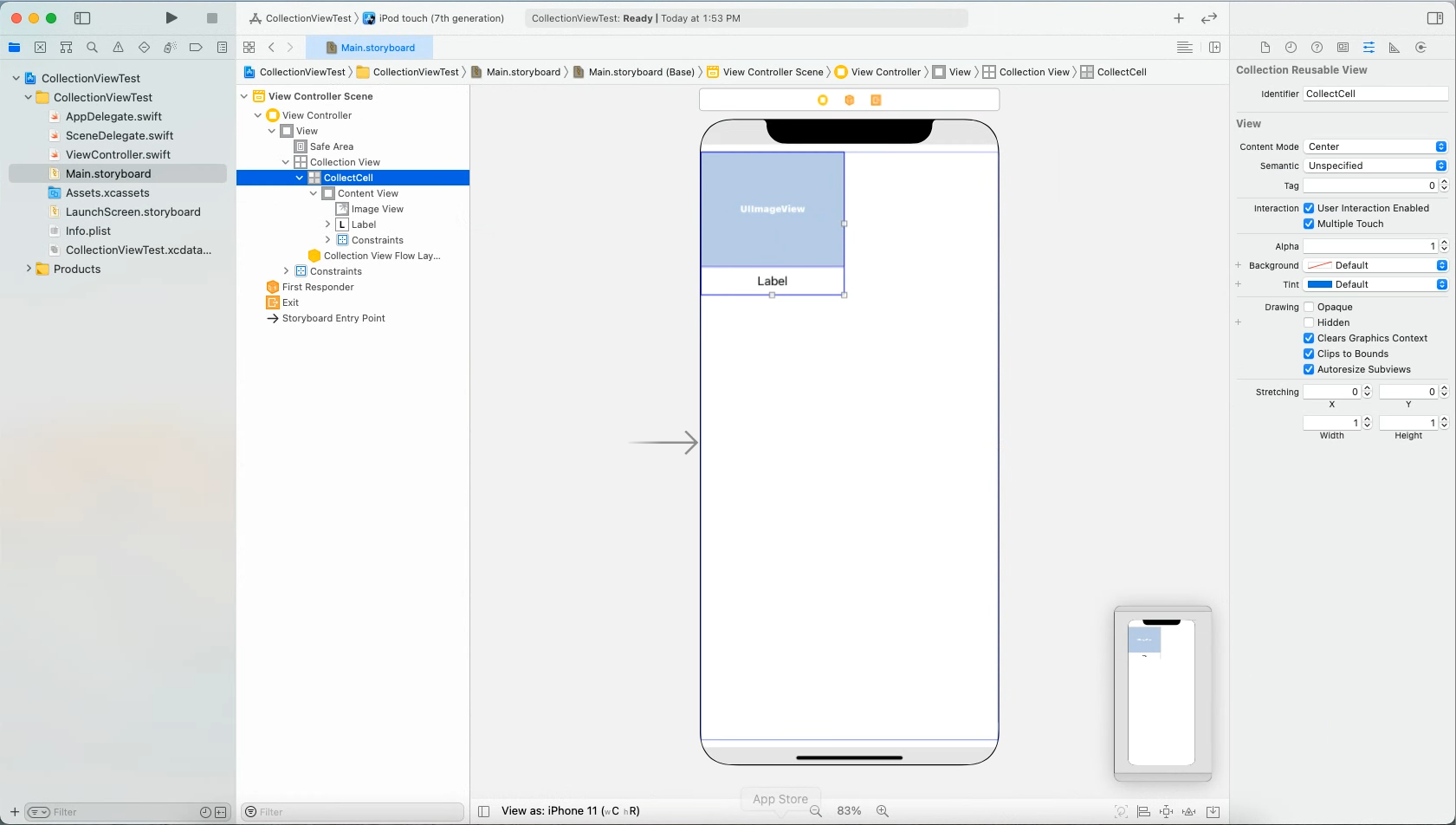 1. Collection View생성 1) collection view를 생성한 후, 위에 표현할 아이템(UILabel) 생성 2) 해당 ViewController를 UIViewContoller를 상속받은 클래스와 연결하고, Collection Cell의 id를 "cell"로 설정..