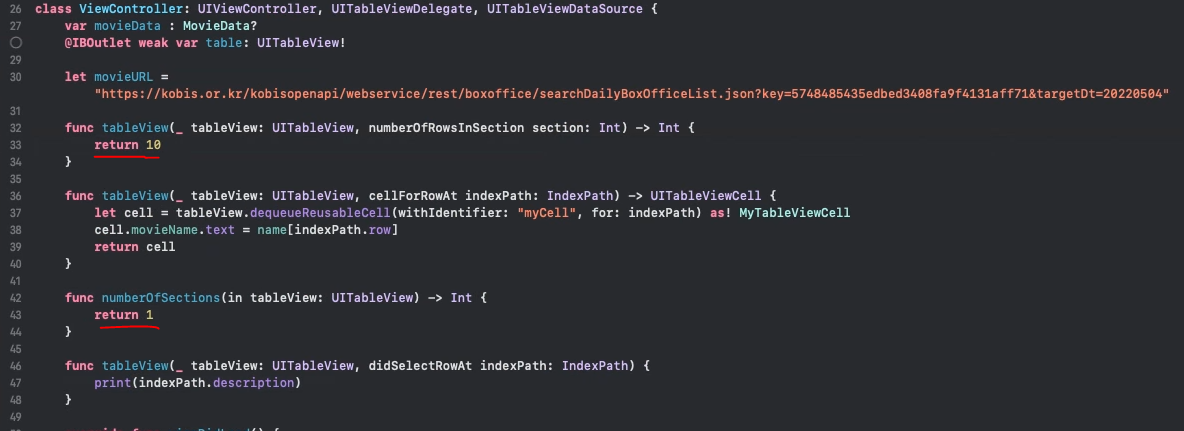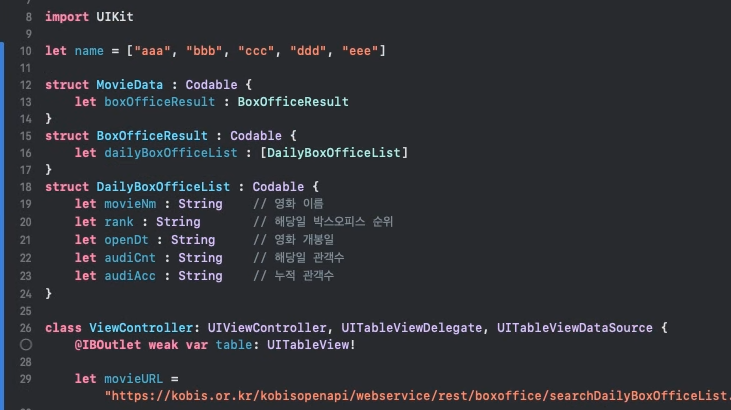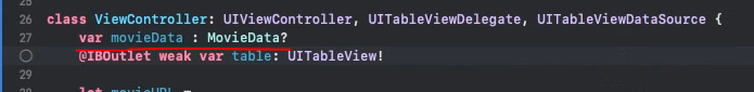 - 방금 출력한 것을 테이블 뷰에 표현하기 위해 MovieData 타입의 movieData라는 변수를 생성하겠습니다.