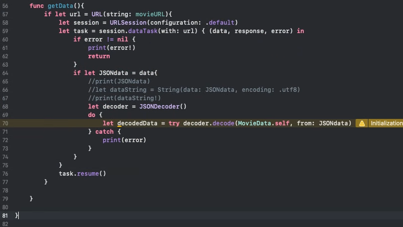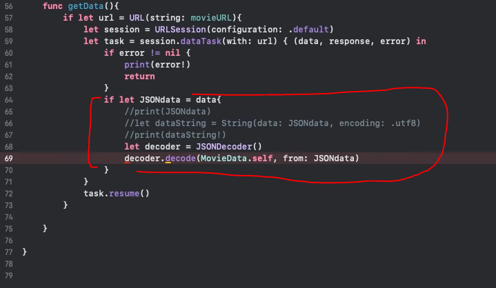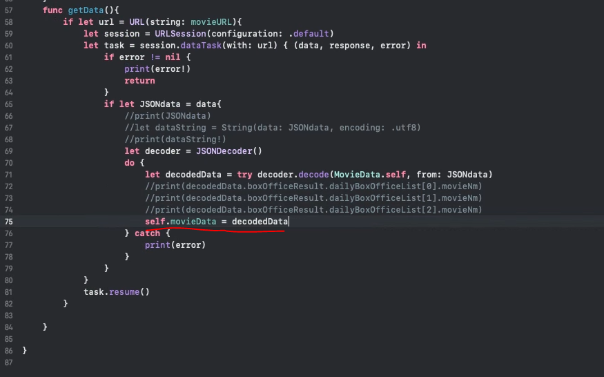 - 그리고 다시 getData 메서드로 돌아와 movieData 변수에 decodedData를 초기화하기 위해 코드를 작성합니다.