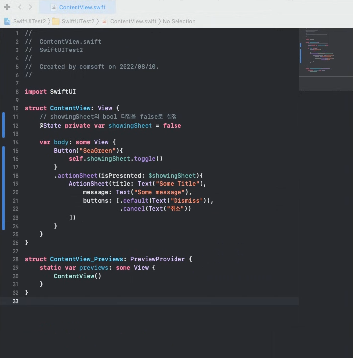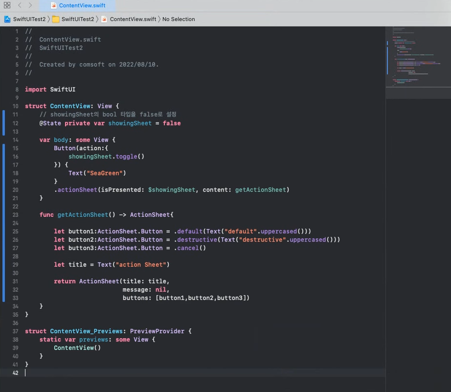 - Alert와 마찬가지로 action Sheet를 표시할지 여부를 추적하는 속성을 정의해야 합니다.