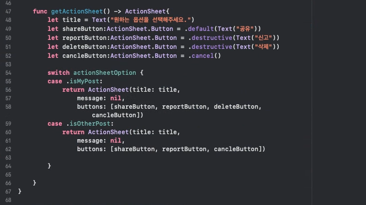 - 함수 작성을 마무리하고 body의 button action의 actionSheetOption을 .isMyPost로 작성해주고 action Sheet 수정자에 getActionSheet을 넣어줍니다.