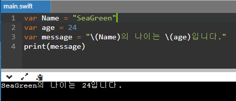var message = "\(Name)의 나이는 \(age)입니다."