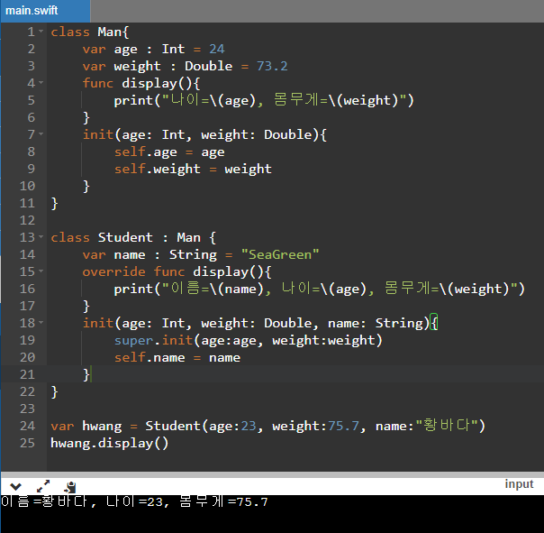 var hwang = Student(age:23, weight:75.7, name:"황바다")