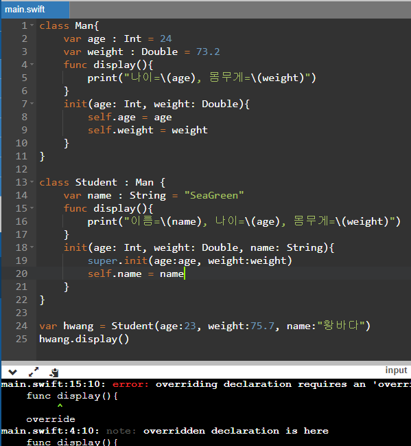 print("이름=\(name), 나이=\(age), 몸무게=\(weight)")